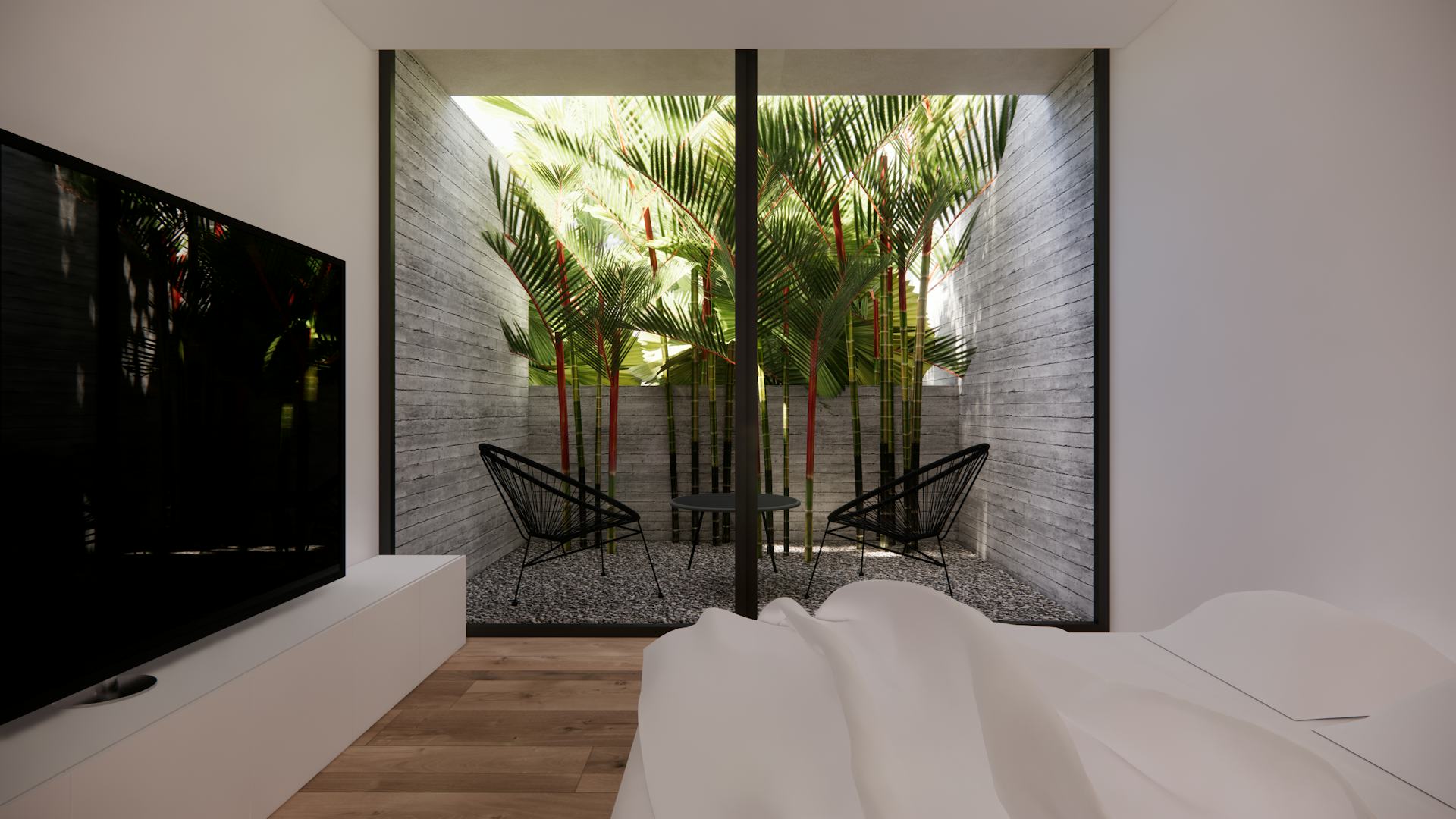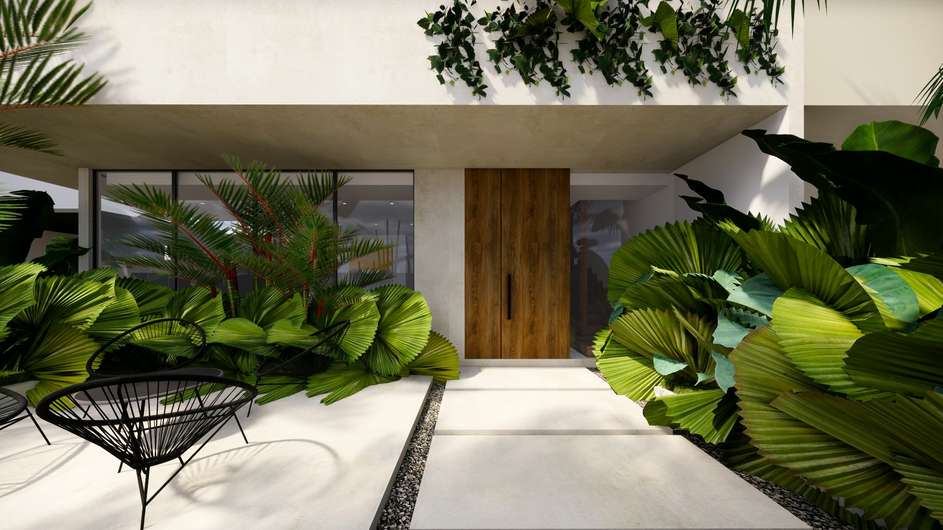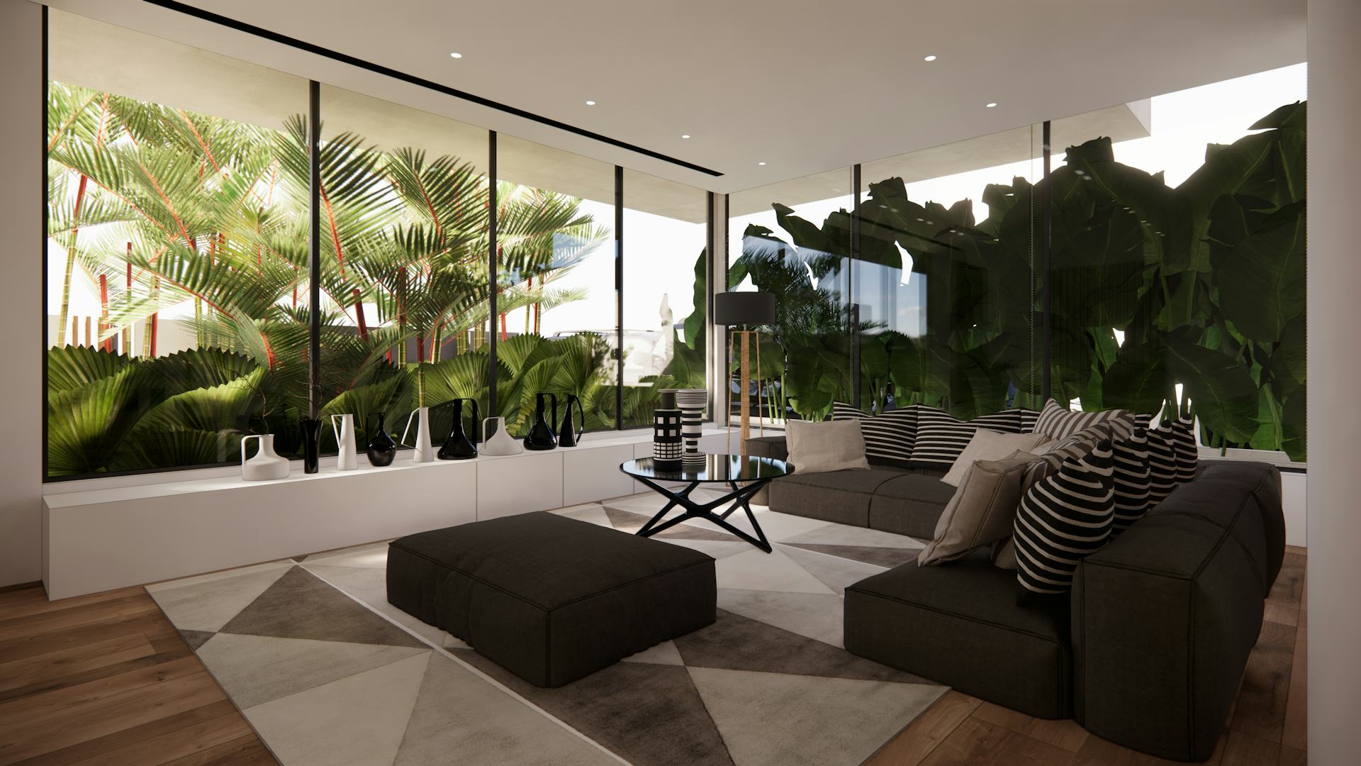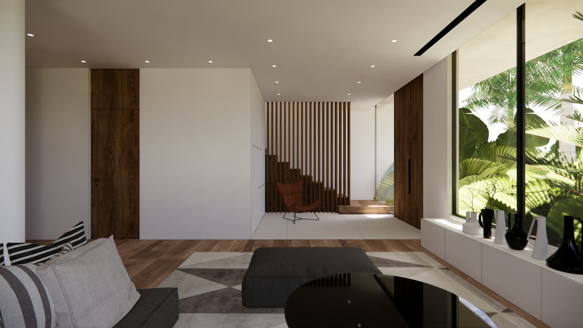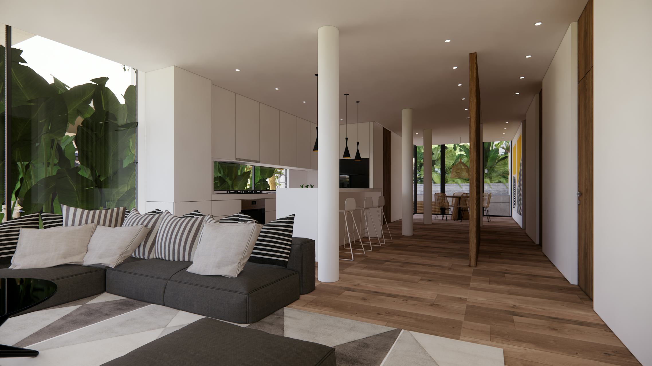 The interiors dialogue with the exterior through full-size windows. Big plants surround the most exposed corner of the house, providing privacy and safety.