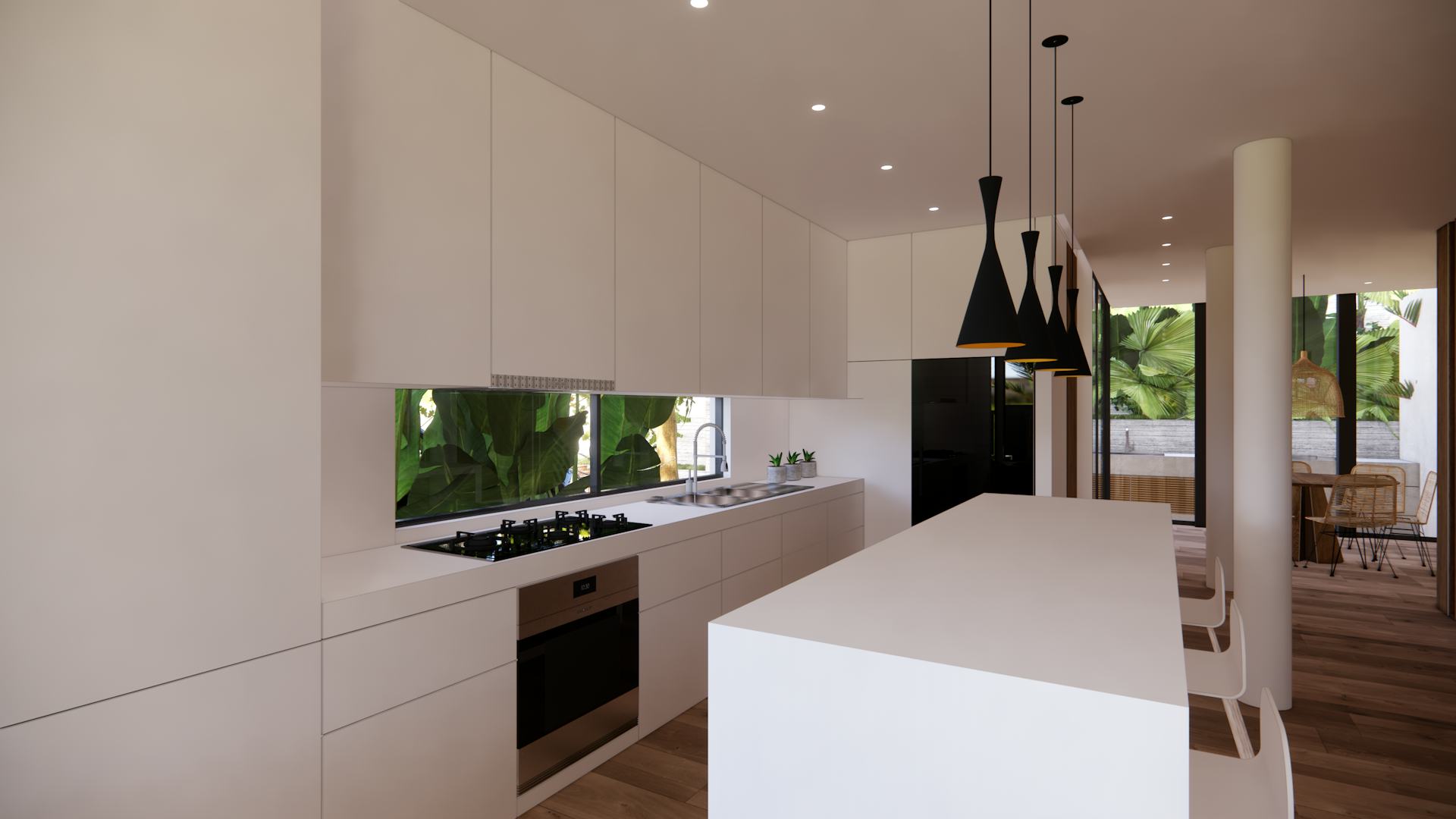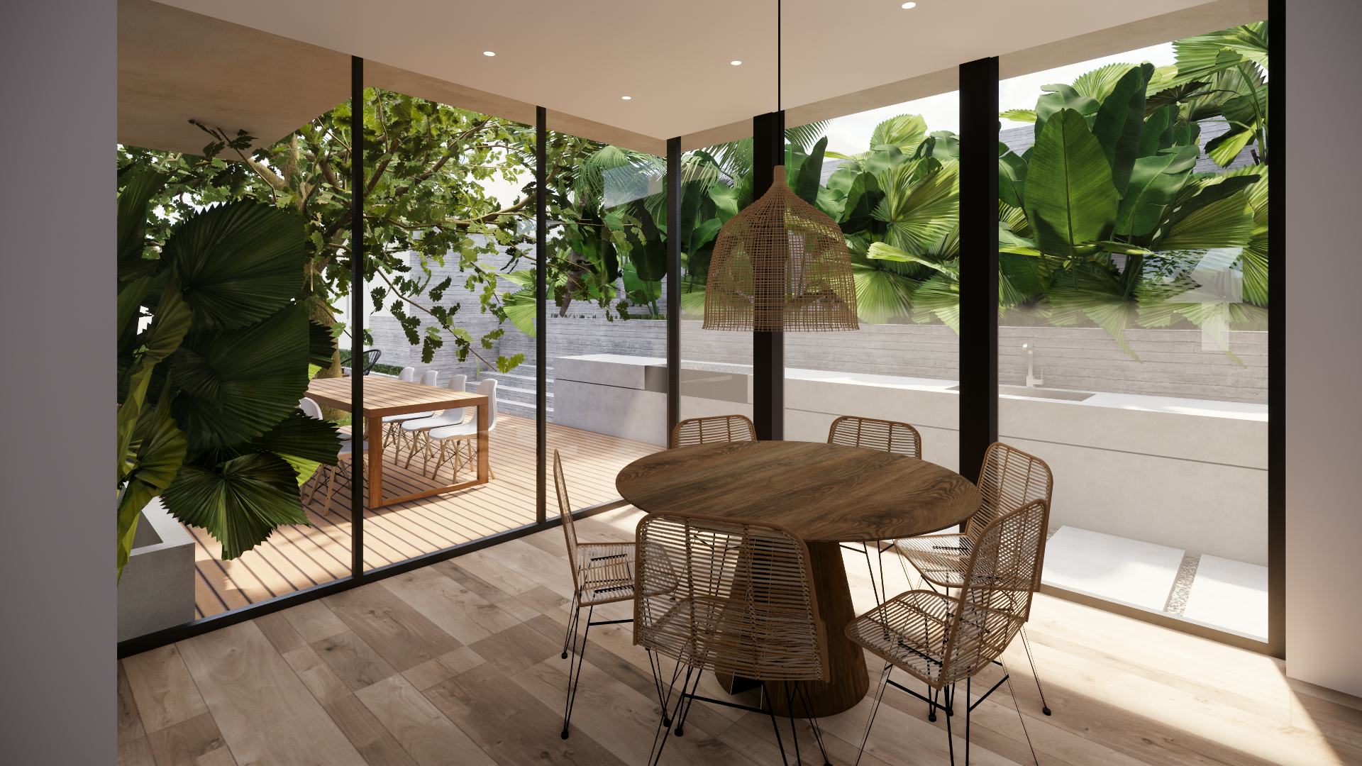 The project consists of an architectural renovation of a twin villa originally built over the ’70s in Kuala Lumpur. The project aimed to improve light gaining without producing overheat and to give a fresh, clean look in and out. Thick tropical vegetation around the house helps to reduce the indoor temperature and providing shade and privacy. As only the structure of the house was retained, the interior layout frees the space from all unnecessary partitions to allow the sunlight to reach the darkest rooms. The design keeps the simplicity of the original villa, avoiding strong contrasts with the twin house.