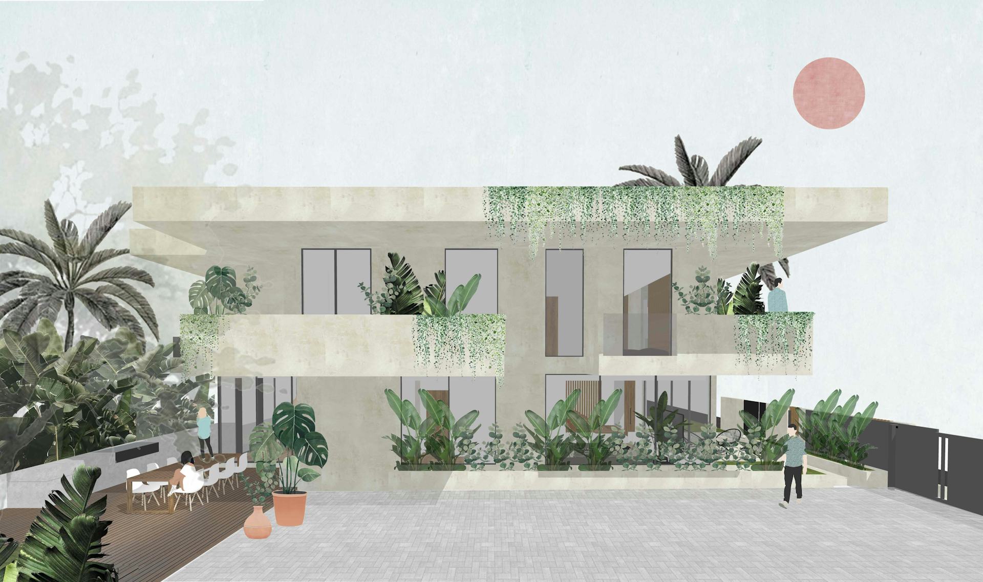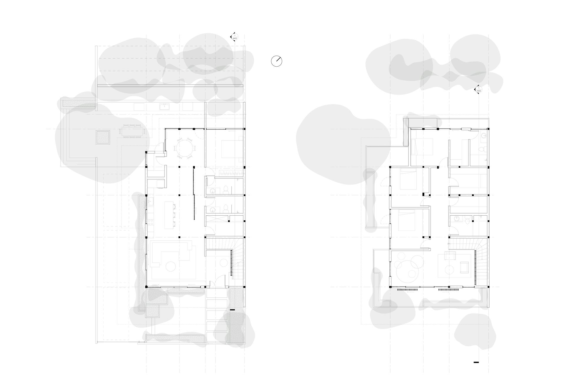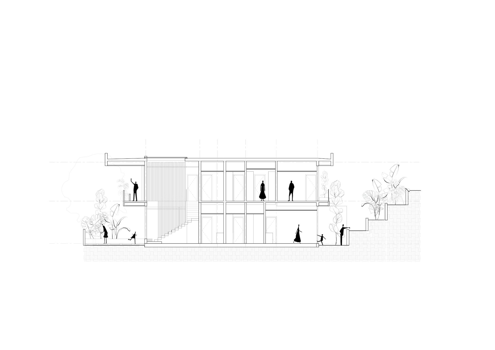 From the original layout, concrete columns and beams have been retained and the ground floor slightly extended to fit one more room and a bigger kitchen. Dry kitchen and living room have been combined to offer one big common area for family and guests. The garden has been connected to the adjacent property, owned by the same family, to host a common large barbecue area featured by a big central tree. On the second floor, the circulation has been improved and some balconies added in order to provide more shade on the ground floor and liveable open spaces upstairs.